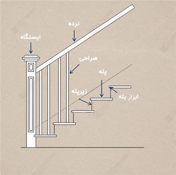 یک ست پله شامل سنگ پله، سنگ زیرپله، ابزار پله، صراحی یا نرده سنگی، نرده و ایستگاه می باشد .