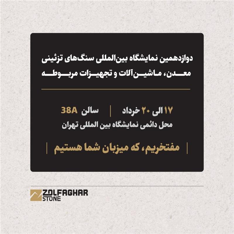 گروه سنگ ذوالفقار مفتخر است حضور خود را در نمایشگاه بین المللی سنگ تهران به استحضار شما همراهان گرامی برساند.